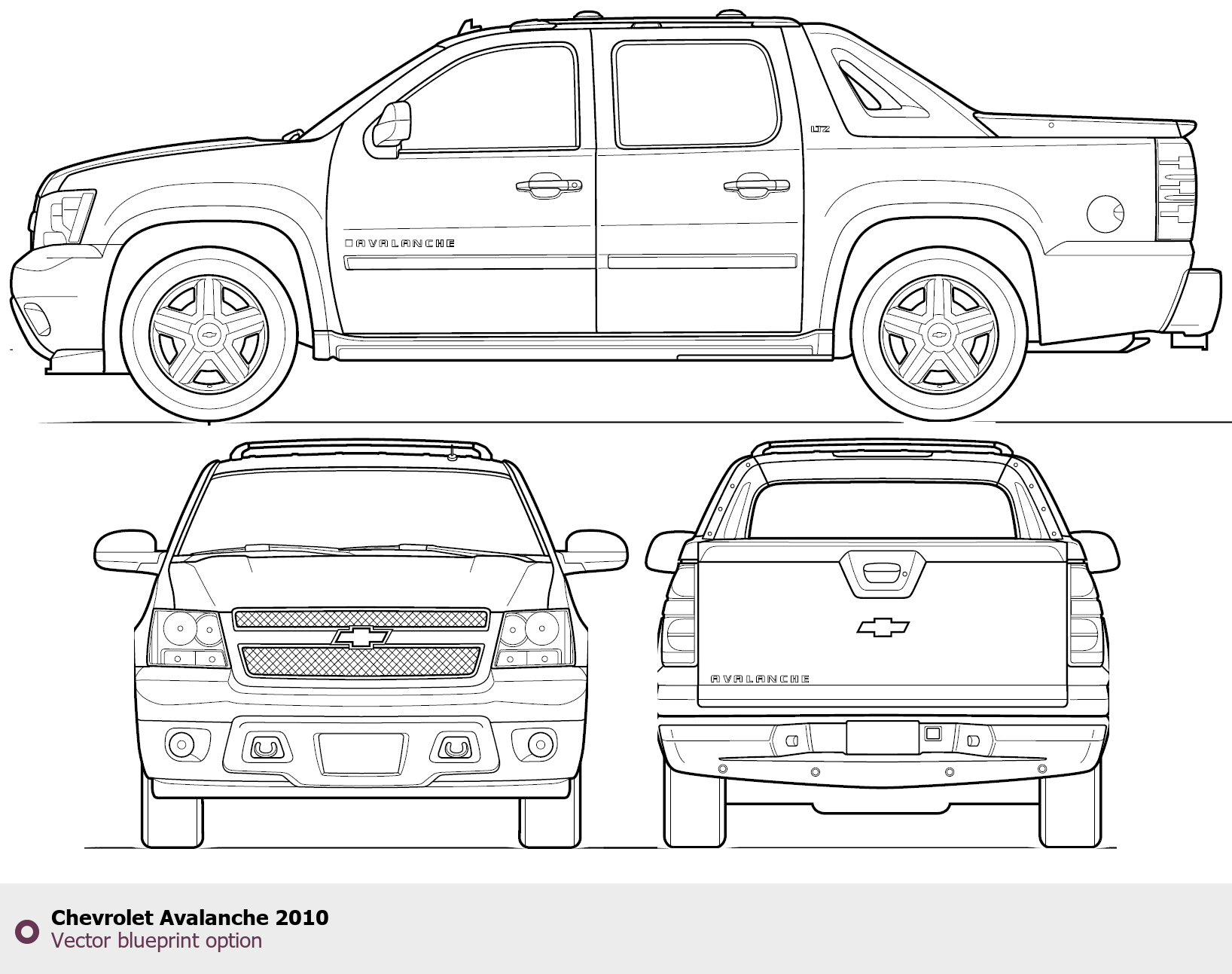 Raster blueprint of the 2010 Chevrolet Avalanche Pickup Truck. This free downloadable image can be used for graphic projects, digital design, and 3D modeling. The file provides accurate exterior proportions of the vehicle. Model year: 2010. Body type: Pickup Truck.