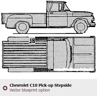 Raster blueprint of the 1962 Chevrolet C10 Pick-up Stepside Pickup Truck. This free downloadable image can be used for graphic projects, digital design, and 3D modeling. The file provides accurate exterior proportions of the vehicle. Model year: 1962. Body type: Pickup Truck.