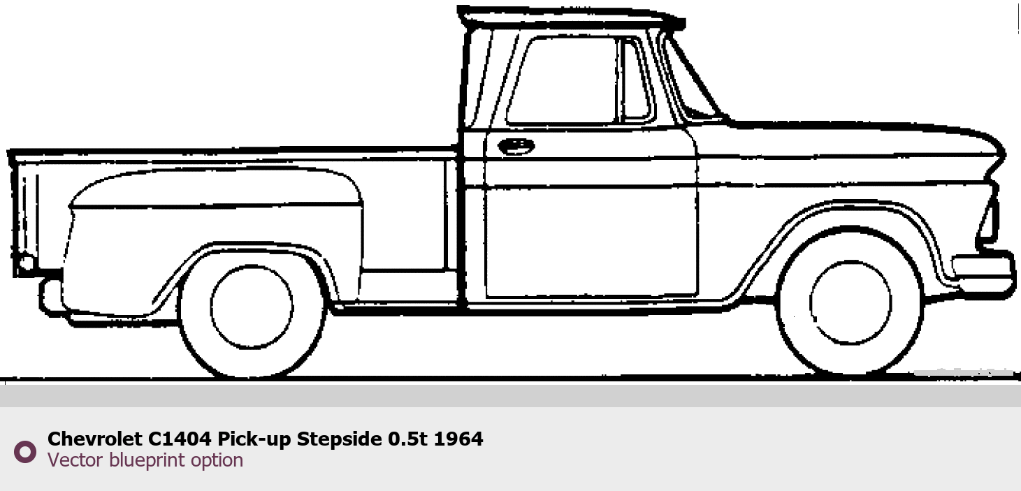 Raster blueprint of the 1964 Chevrolet C1404 Pick-up Stepside 0.5t Pickup Truck. This free downloadable image can be used for graphic projects, digital design, and 3D modeling. The file provides accurate exterior proportions of the vehicle. Model year: 1964. Body type: Pickup Truck.