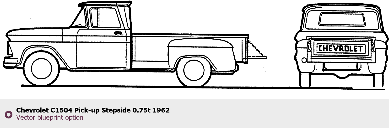 Raster blueprint of the 1962 Chevrolet C1504 Pick-up Stepside 0.75t Pickup Truck. This free downloadable image can be used for graphic projects, digital design, and 3D modeling. The file provides accurate exterior proportions of the vehicle. Model year: 1962. Body type: Pickup Truck.