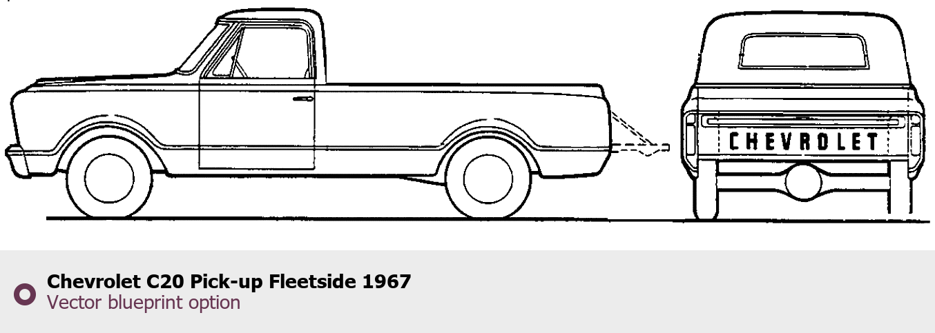 Raster blueprint of the 1967 Chevrolet C20 Pick-up Fleetside Pickup Truck. This free downloadable image can be used for graphic projects, digital design, and 3D modeling. The file provides accurate exterior proportions of the vehicle. Model year: 1967. Body type: Pickup Truck.