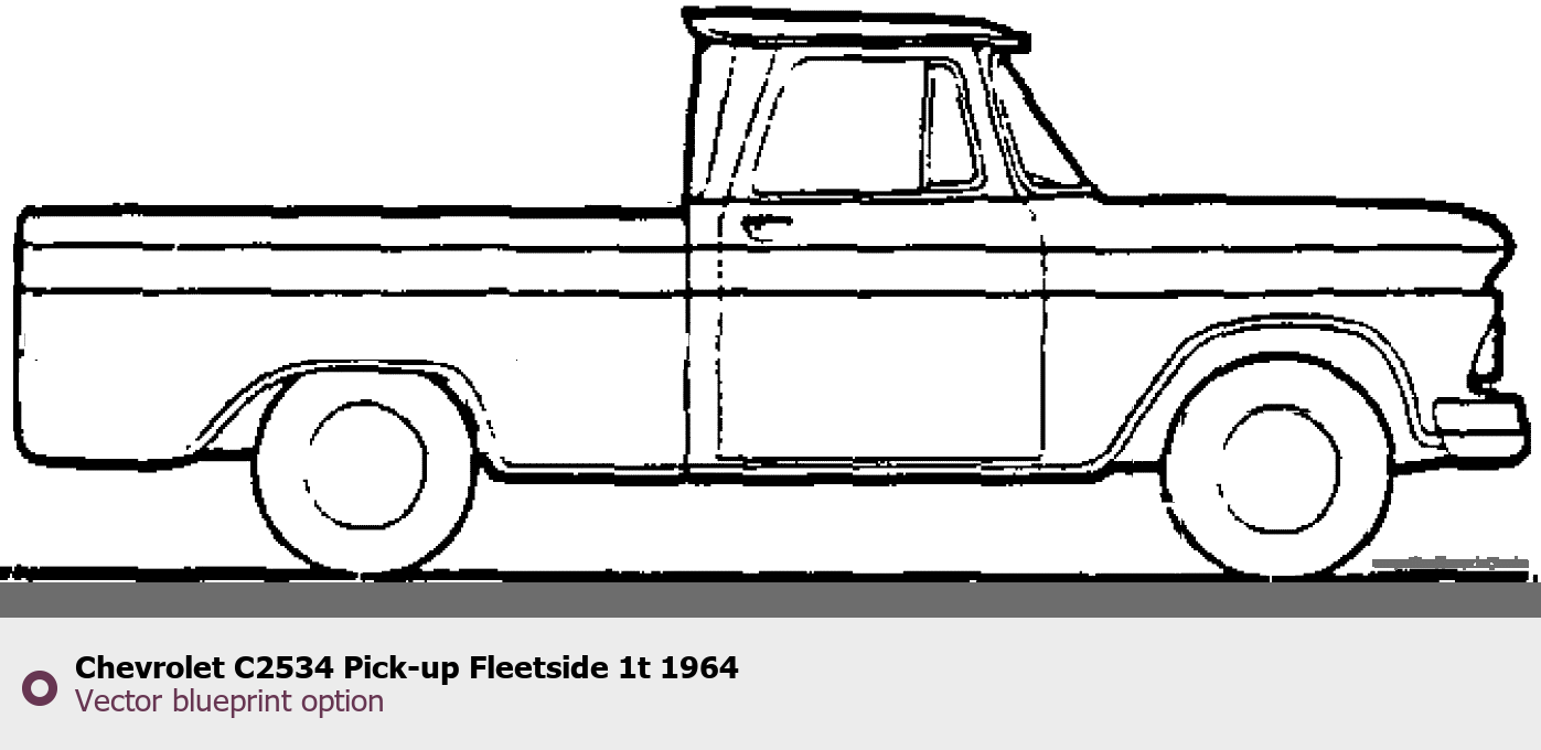 Raster blueprint of the 1964 Chevrolet C2534 Pick-up Fleetside 1t Pickup Truck. This free downloadable image can be used for graphic projects, digital design, and 3D modeling. The file provides accurate exterior proportions of the vehicle. Model year: 1964. Body type: Pickup Truck.