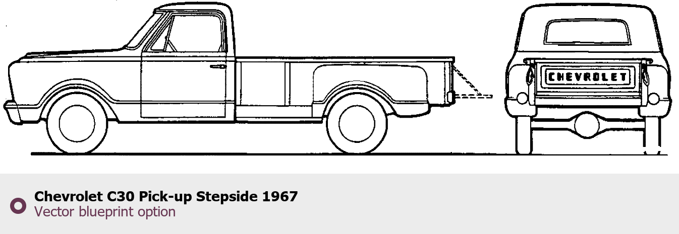 Raster blueprint of the 1967 Chevrolet C30 Pick-up Stepside Pickup Truck. This free downloadable image can be used for graphic projects, digital design, and 3D modeling. The file provides accurate exterior proportions of the vehicle. Model year: 1967. Body type: Pickup Truck.