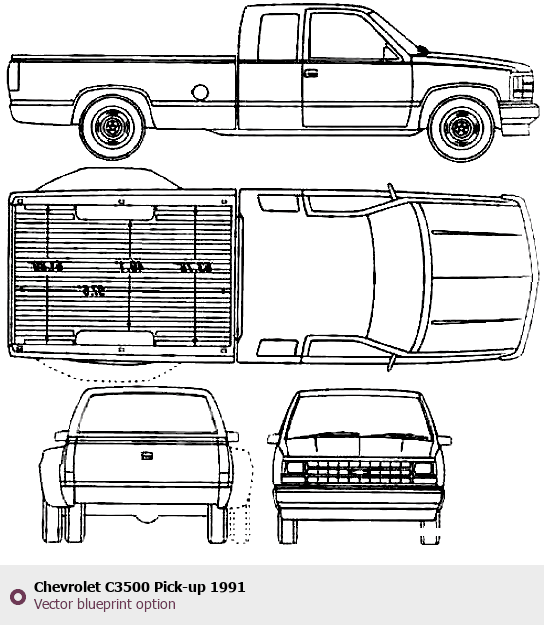 Raster blueprint of the 1991 Chevrolet C3500 Pick-up Pickup Truck. This free downloadable image can be used for graphic projects, digital design, and 3D modeling. The file provides accurate exterior proportions of the vehicle. Model year: 1991. Body type: Pickup Truck.
