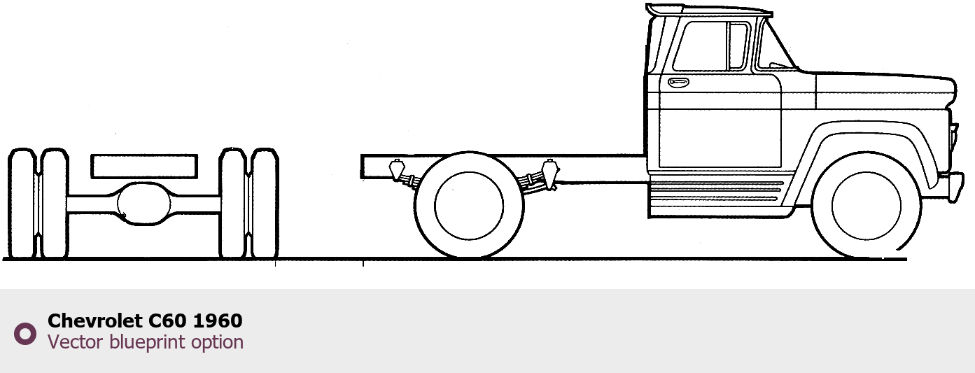 Raster blueprint of the 1960 Chevrolet C60 Tag. This free downloadable image can be used for graphic projects, digital design, and 3D modeling. The file provides accurate exterior proportions of the vehicle. Model year: 1960. Body type: Tag.