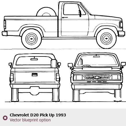 Raster blueprint of the 1993 Chevrolet D20 Pick Up Tag. This free downloadable image can be used for graphic projects, digital design, and 3D modeling. The file provides accurate exterior proportions of the vehicle. Model year: 1993. Body type: Tag.