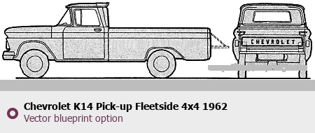 Raster blueprint of the 1962 Chevrolet K14 Pick-up Fleetside 4x4 Pickup Truck. This free downloadable image can be used for graphic projects, digital design, and 3D modeling. The file provides accurate exterior proportions of the vehicle. Model year: 1962. Body type: Pickup Truck.