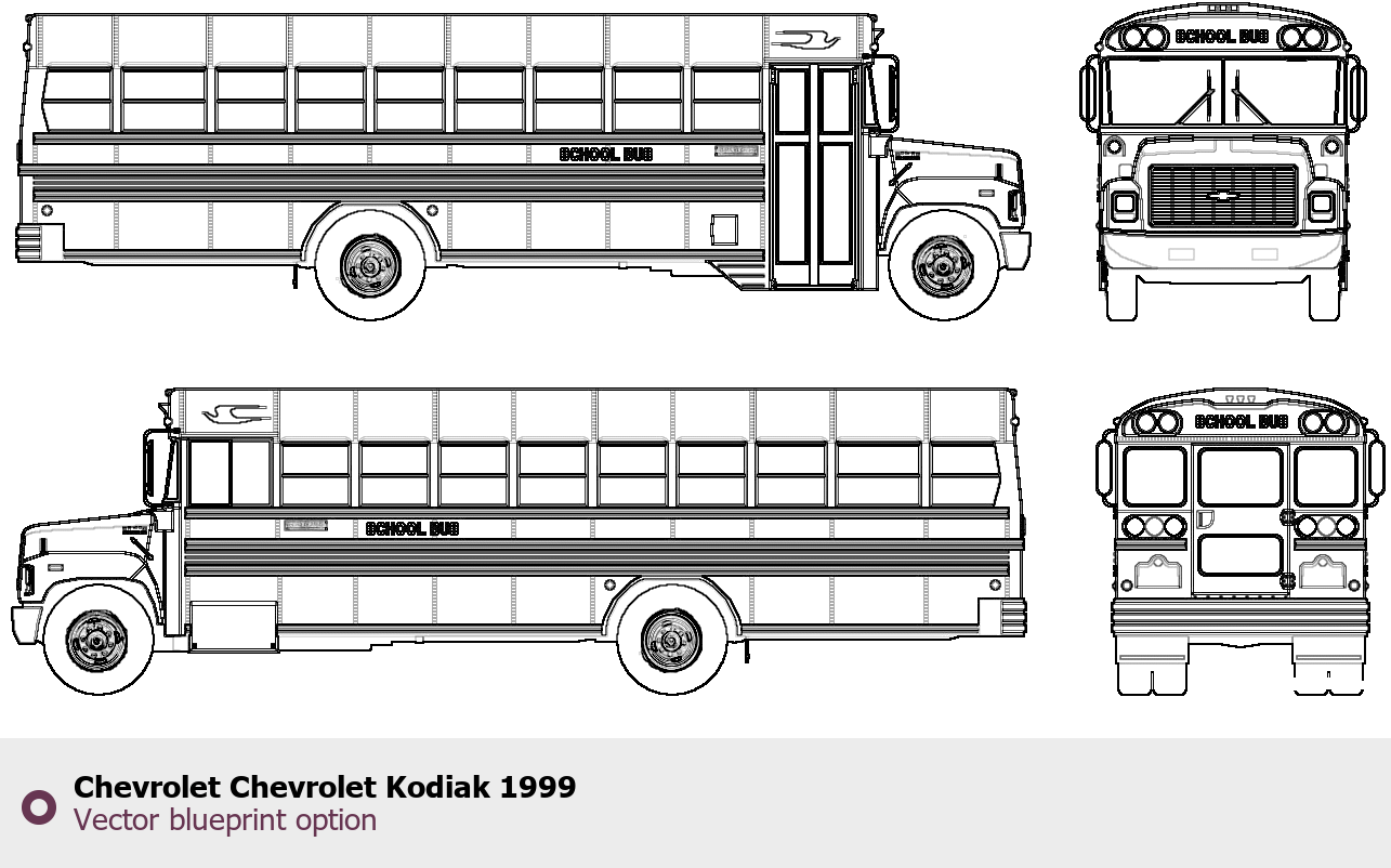Raster blueprint of the 1999 Chevrolet Kodiak Bus. This free downloadable image can be used for graphic projects, digital design, and 3D modeling. The file provides accurate exterior proportions of the vehicle. Model year: 1999. Body type: Bus.