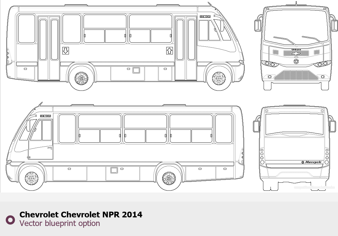 Raster blueprint of the 2014 Chevrolet NPR Bus. This free downloadable image can be used for graphic projects, digital design, and 3D modeling. The file provides accurate exterior proportions of the vehicle. Model year: 2014. Body type: Bus.