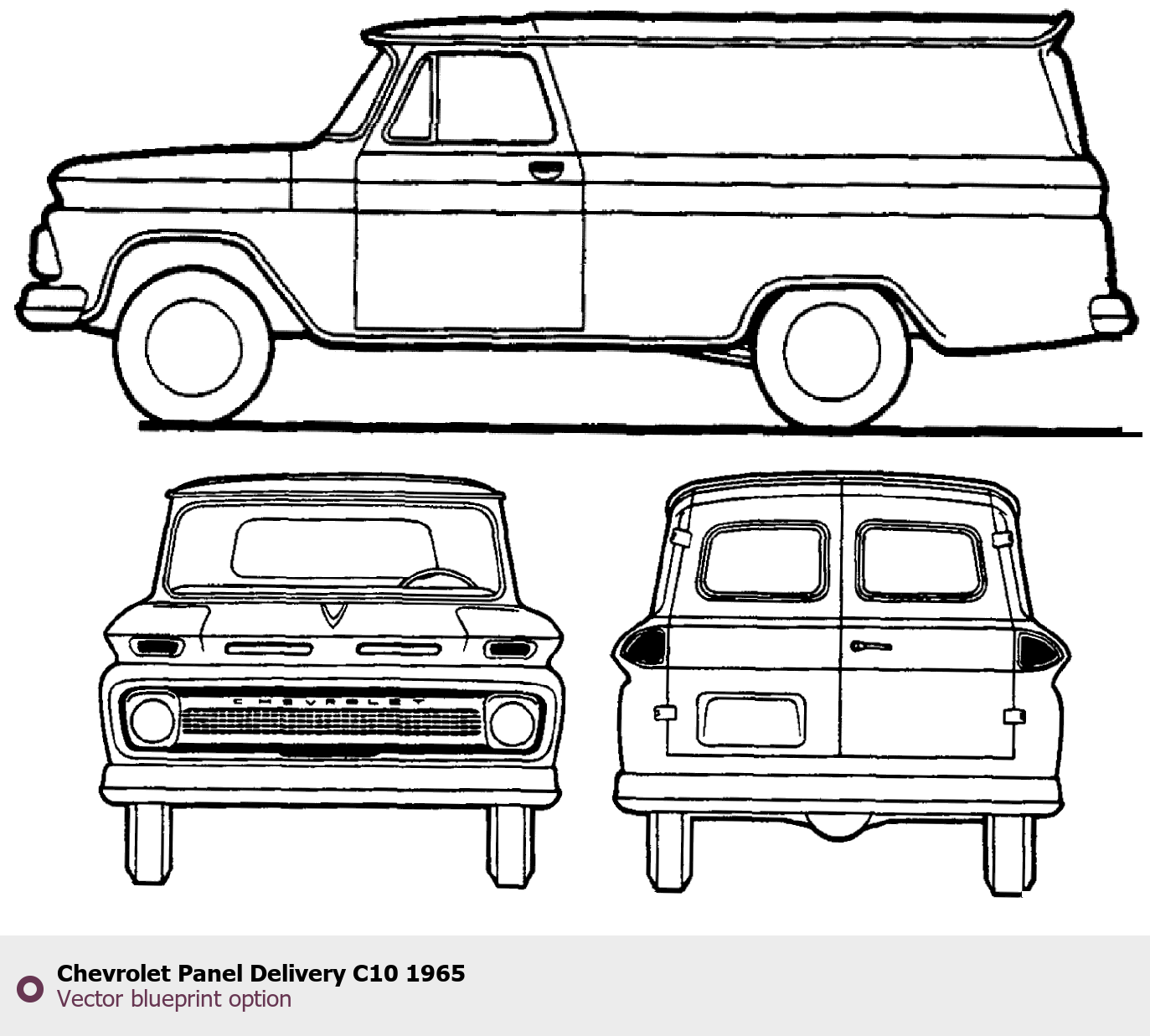 Raster blueprint of the 1965 Chevrolet Panel Delivery C10 Pickup Truck. This free downloadable image can be used for graphic projects, digital design, and 3D modeling. The file provides accurate exterior proportions of the vehicle. Model year: 1965. Body type: Pickup Truck.