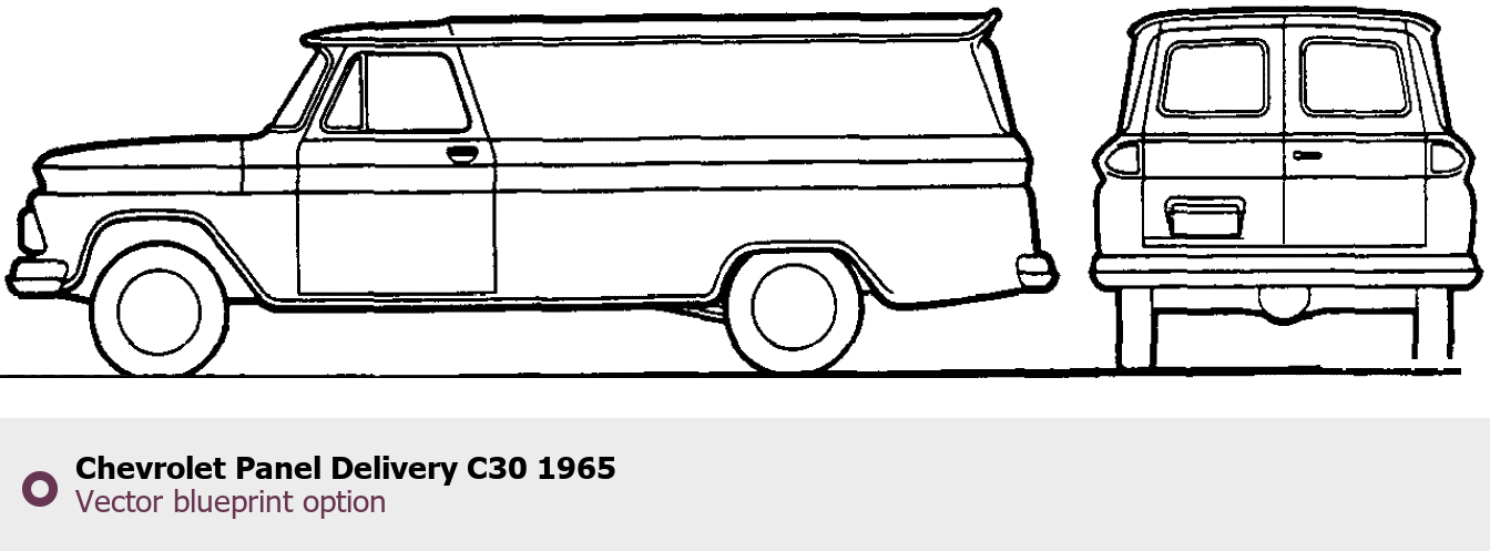 Raster blueprint of the 1965 Chevrolet Panel Delivery C30 Tag. This free downloadable image can be used for graphic projects, digital design, and 3D modeling. The file provides accurate exterior proportions of the vehicle. Model year: 1965. Body type: Tag.
