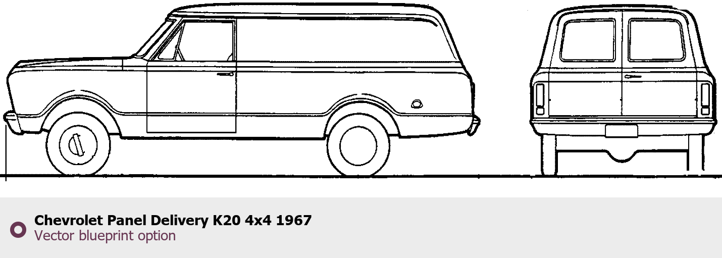 Raster blueprint of the 1967 Chevrolet Panel Delivery K20 4x4 Tag. This free downloadable image can be used for graphic projects, digital design, and 3D modeling. The file provides accurate exterior proportions of the vehicle. Model year: 1967. Body type: Tag.