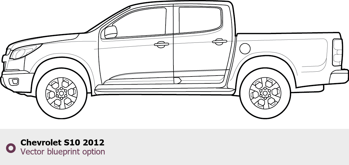 Raster blueprint of the 2012 Chevrolet S10 Pickup Truck. This free downloadable image can be used for graphic projects, digital design, and 3D modeling. The file provides accurate exterior proportions of the vehicle. Model year: 2012. Body type: Pickup Truck.