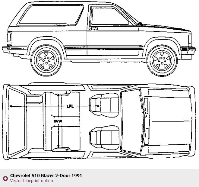 Raster blueprint of the 1991 Chevrolet S10 Blazer 2-Door Pickup Truck. This free downloadable image can be used for graphic projects, digital design, and 3D modeling. The file provides accurate exterior proportions of the vehicle. Model year: 1991. Body type: Pickup Truck.
