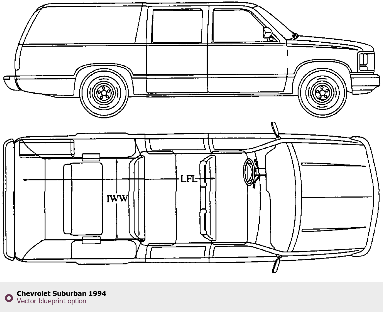 Raster blueprint of the 1994 Chevrolet Suburban SUV. This free downloadable image can be used for graphic projects, digital design, and 3D modeling. The file provides accurate exterior proportions of the vehicle. Model year: 1994. Body type: SUV.