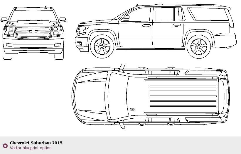 Raster blueprint of the 2015 Chevrolet Suburban SUV. This free downloadable image can be used for graphic projects, digital design, and 3D modeling. The file provides accurate exterior proportions of the vehicle. Model year: 2015. Body type: SUV.