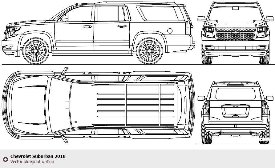 Raster blueprint of the 2018 Chevrolet Suburban SUV. This free downloadable image can be used for graphic projects, digital design, and 3D modeling. The file provides accurate exterior proportions of the vehicle. Model year: 2018. Body type: SUV.