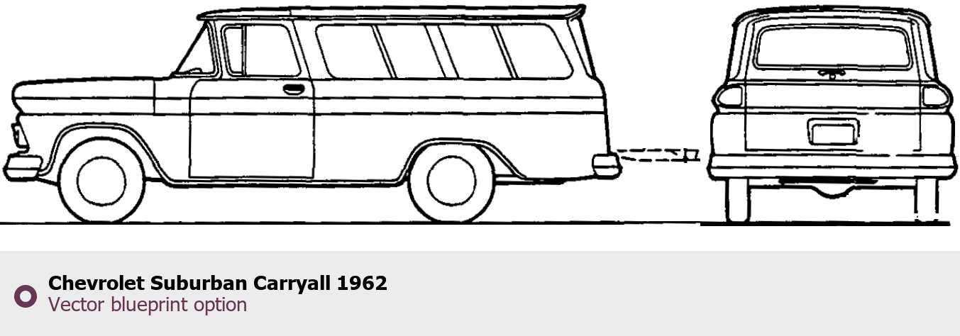Raster blueprint of the 1962 Chevrolet Suburban Carryall SUV. This free downloadable image can be used for graphic projects, digital design, and 3D modeling. The file provides accurate exterior proportions of the vehicle. Model year: 1962. Body type: SUV.