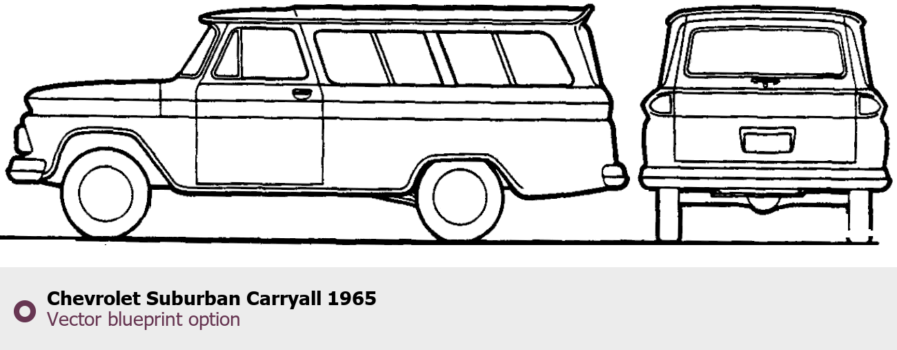 Raster blueprint of the 1965 Chevrolet Suburban Carryall SUV. This free downloadable image can be used for graphic projects, digital design, and 3D modeling. The file provides accurate exterior proportions of the vehicle. Model year: 1965. Body type: SUV.