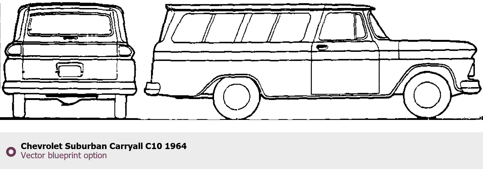 Raster blueprint of the 1964 Chevrolet Suburban Carryall C10 SUV. This free downloadable image can be used for graphic projects, digital design, and 3D modeling. The file provides accurate exterior proportions of the vehicle. Model year: 1964. Body type: SUV.