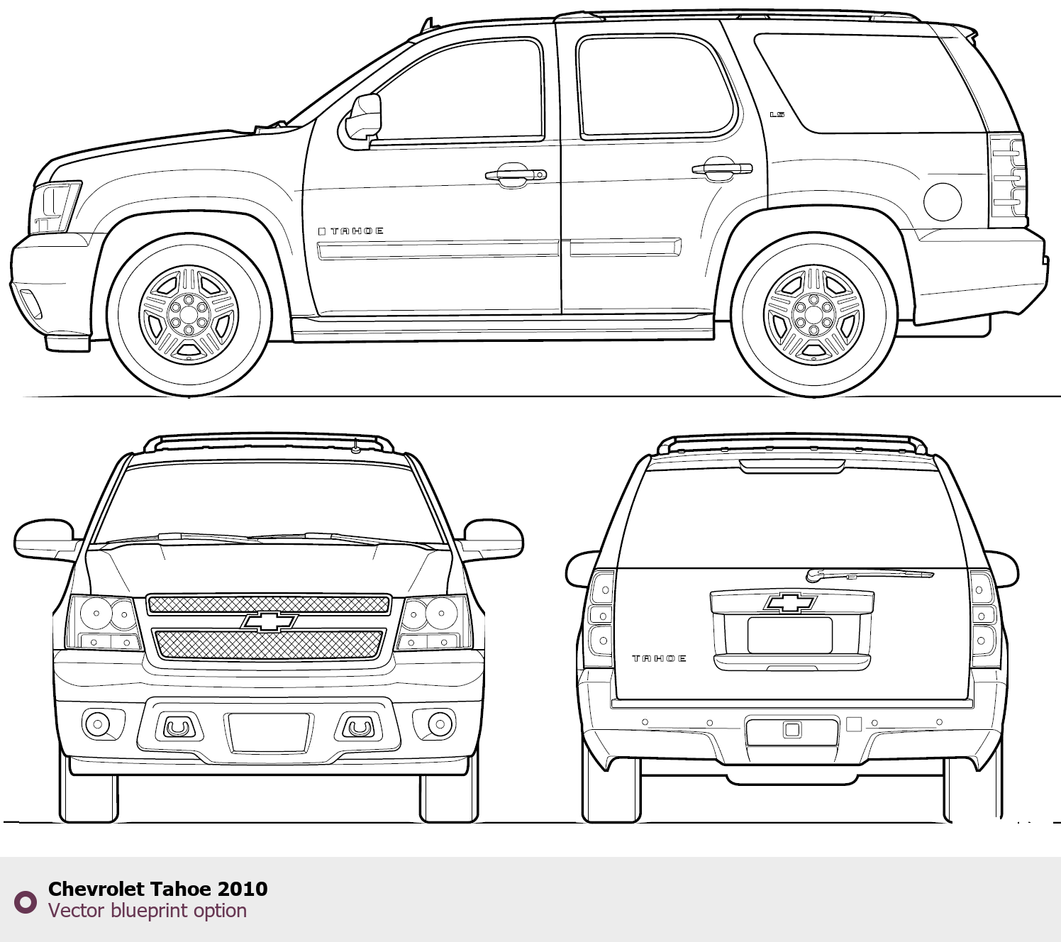 Raster blueprint of the 2010 Chevrolet Tahoe SUV. This free downloadable image can be used for graphic projects, digital design, and 3D modeling. The file provides accurate exterior proportions of the vehicle. Model year: 2010. Body type: SUV.