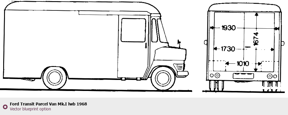 Raster blueprint of the 1968 Ford Transit Parcel Van Mk.I lwb Van. This free downloadable image can be used for graphic projects, digital design, and 3D modeling. The file provides accurate exterior proportions of the vehicle. Model year: 1968. Body type: Van.