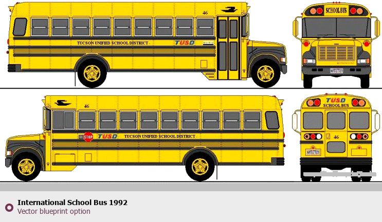 Raster blueprint of the 1992 International School Bus Bus. This free downloadable image can be used for graphic projects, digital design, and 3D modeling. The file provides accurate exterior proportions of the vehicle. Model year: 1992. Body type: Bus.