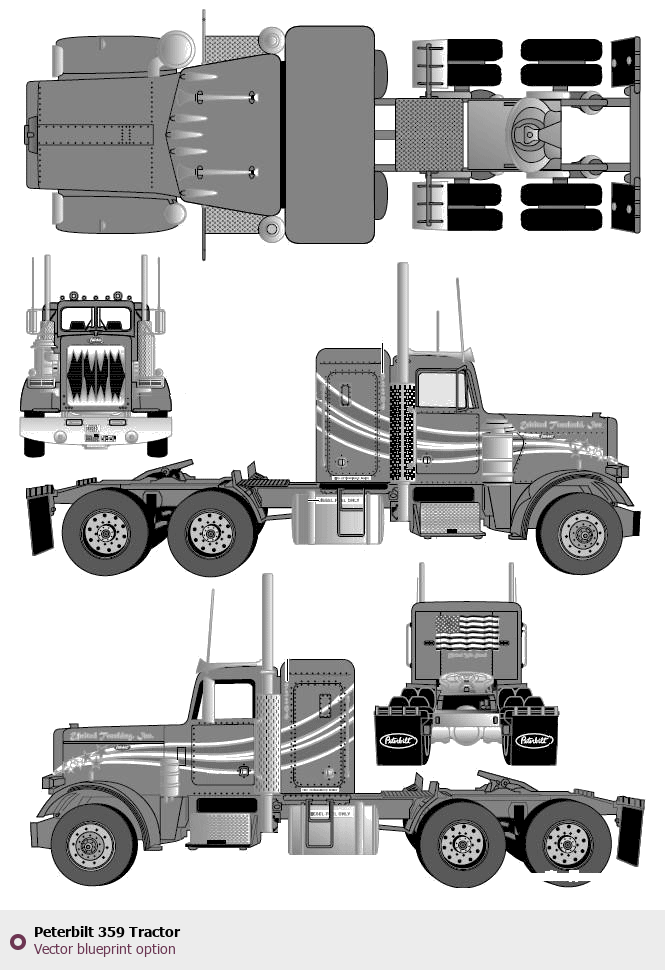 Raster blueprint of the Peterbilt 359 Tractor Heavy Truck. This free downloadable image can be used for graphic projects, digital design, and 3D modeling. The file provides accurate exterior proportions of the vehicle. Body type: Heavy Truck.