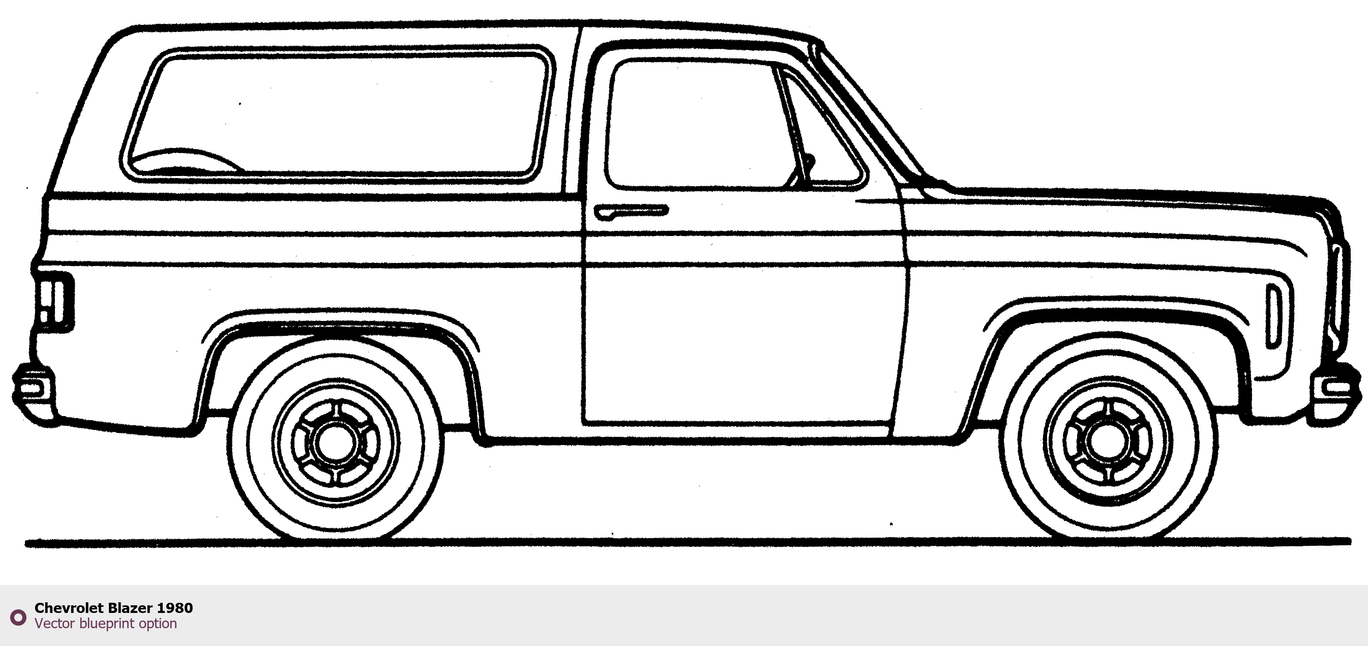 Raster blueprint of the 1980 Chevrolet Blazer SUV. This free downloadable image can be used for graphic projects, digital design, and 3D modeling. The file provides accurate exterior proportions of the vehicle. Model year: 1980. Body type: SUV.