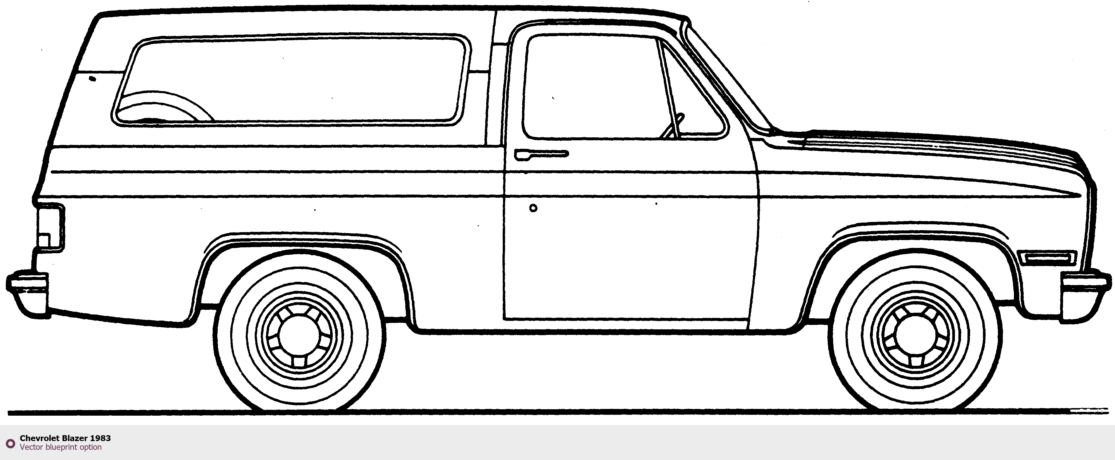 Raster blueprint of the 1983 Chevrolet Blazer SUV. This free downloadable image can be used for graphic projects, digital design, and 3D modeling. The file provides accurate exterior proportions of the vehicle. Model year: 1983. Body type: SUV.