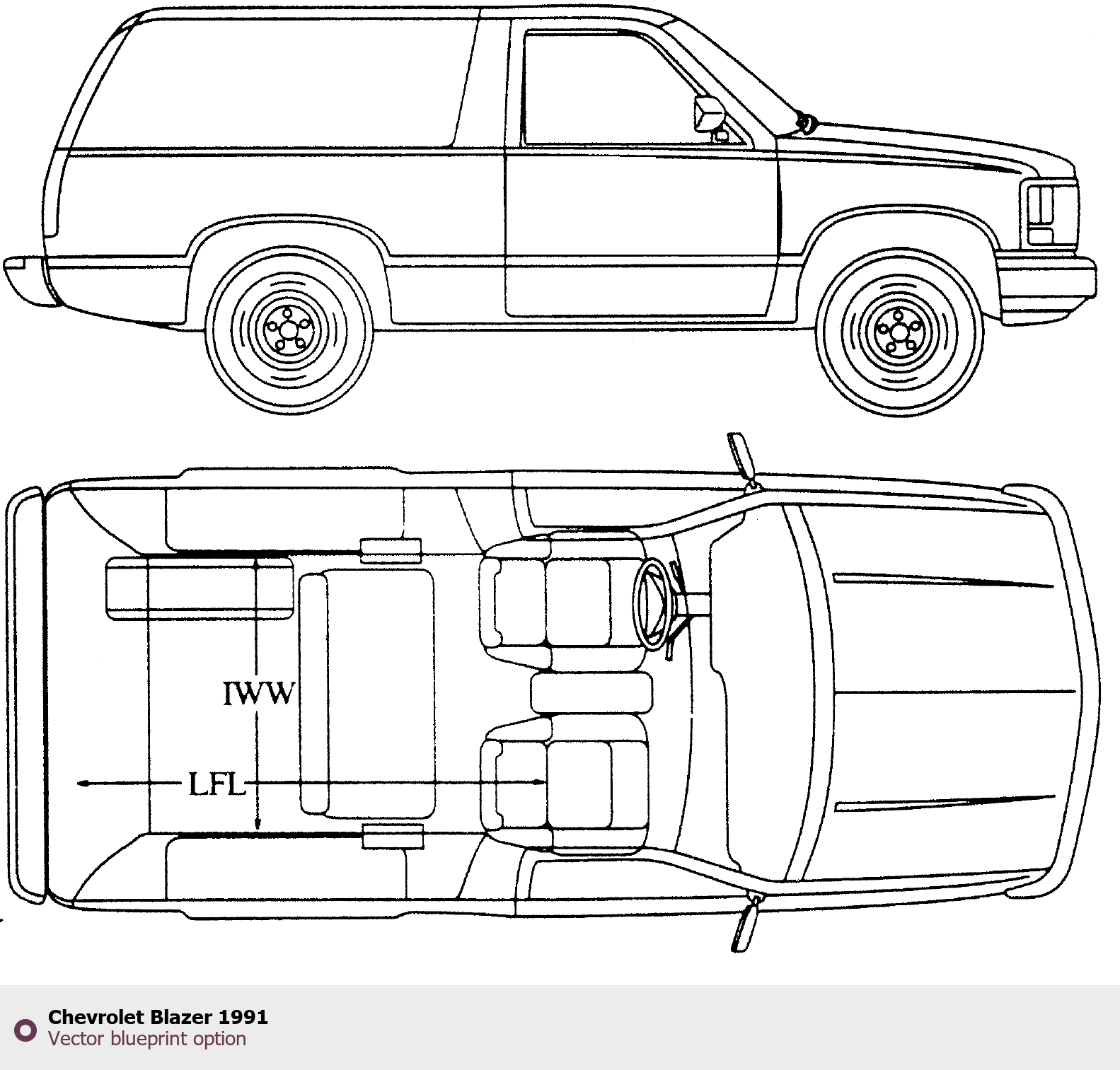 Raster blueprint of the 1991 Chevrolet Blazer SUV. This free downloadable image can be used for graphic projects, digital design, and 3D modeling. The file provides accurate exterior proportions of the vehicle. Model year: 1991. Body type: SUV.