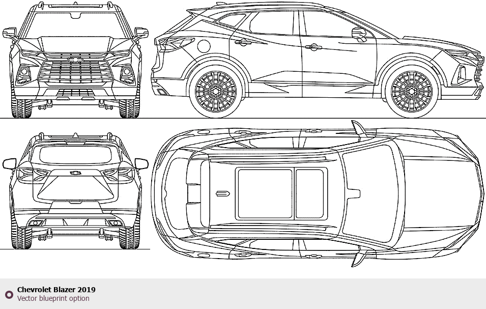 Raster blueprint of the 2019 Chevrolet Blazer SUV. This free downloadable image can be used for graphic projects, digital design, and 3D modeling. The file provides accurate exterior proportions of the vehicle. Model year: 2019. Body type: SUV.