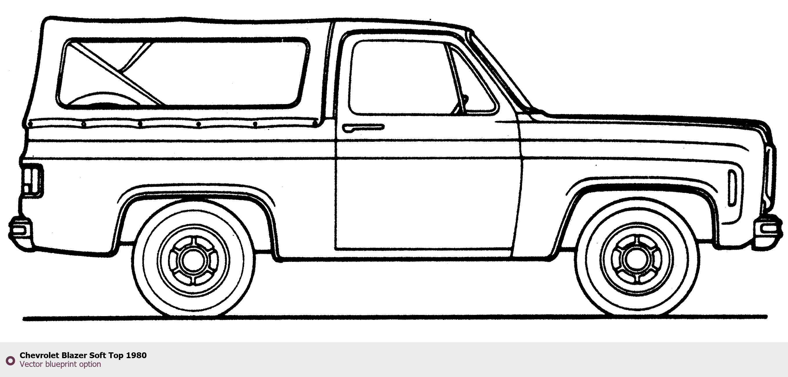Raster blueprint of the 1980 Chevrolet Blazer Soft Top SUV. This free downloadable image can be used for graphic projects, digital design, and 3D modeling. The file provides accurate exterior proportions of the vehicle. Model year: 1980. Body type: SUV.