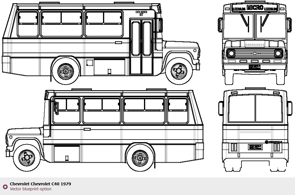 Raster blueprint of the 1979 Chevrolet C40 Bus. This free downloadable image can be used for graphic projects, digital design, and 3D modeling. The file provides accurate exterior proportions of the vehicle. Model year: 1979. Body type: Bus.