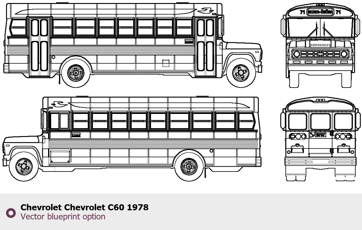 Raster blueprint of the 1978 Chevrolet C60 Bus. This free downloadable image can be used for graphic projects, digital design, and 3D modeling. The file provides accurate exterior proportions of the vehicle. Model year: 1978. Body type: Bus.