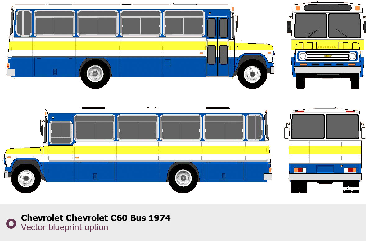 Raster blueprint of the 1974 Chevrolet C60 Bus Bus. This free downloadable image can be used for graphic projects, digital design, and 3D modeling. The file provides accurate exterior proportions of the vehicle. Model year: 1974. Body type: Bus.