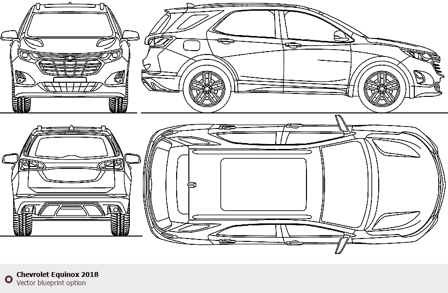 Raster blueprint of the 2018 Chevrolet Equinox SUV. This free downloadable image can be used for graphic projects, digital design, and 3D modeling. The file provides accurate exterior proportions of the vehicle. Model year: 2018. Body type: SUV.
