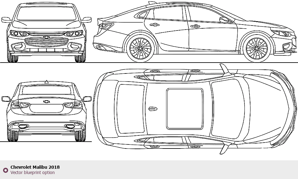 Raster blueprint of the 2018 Chevrolet Malibu Tag. This free downloadable image can be used for graphic projects, digital design, and 3D modeling. The file provides accurate exterior proportions of the vehicle. Model year: 2018. Body type: Tag.