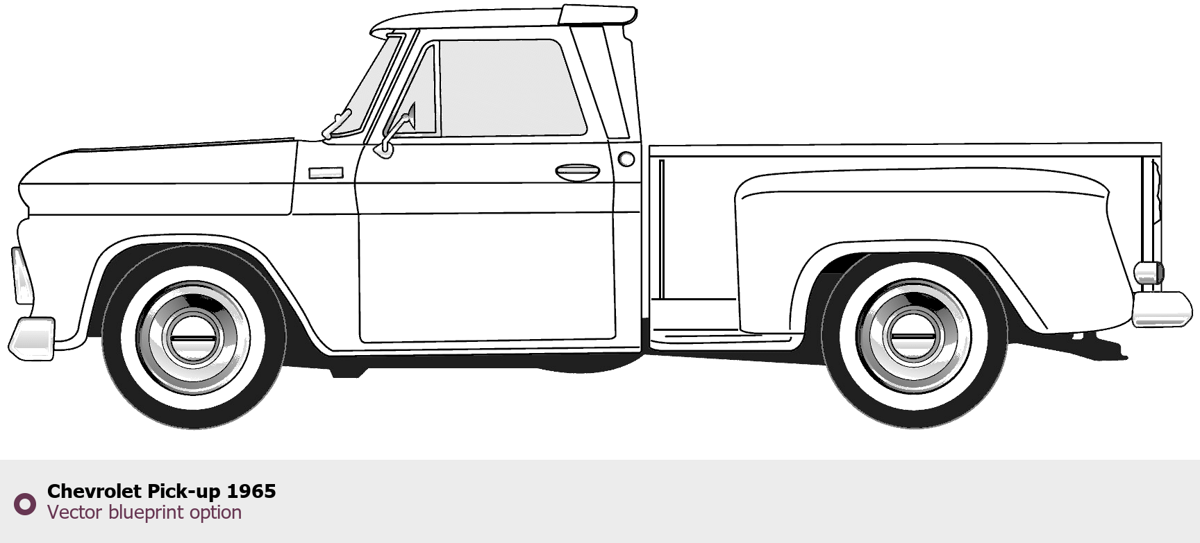 Raster blueprint of the 1965 Chevrolet Pick-up Pickup Truck. This free downloadable image can be used for graphic projects, digital design, and 3D modeling. The file provides accurate exterior proportions of the vehicle. Model year: 1965. Body type: Pickup Truck.
