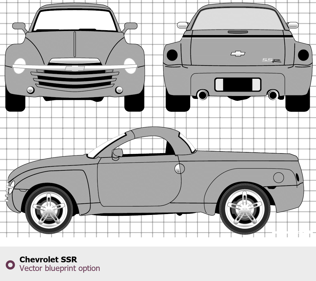 Raster blueprint of the Chevrolet SSR Pickup Truck. This free downloadable image can be used for graphic projects, digital design, and 3D modeling. The file provides accurate exterior proportions of the vehicle. Body type: Pickup Truck.