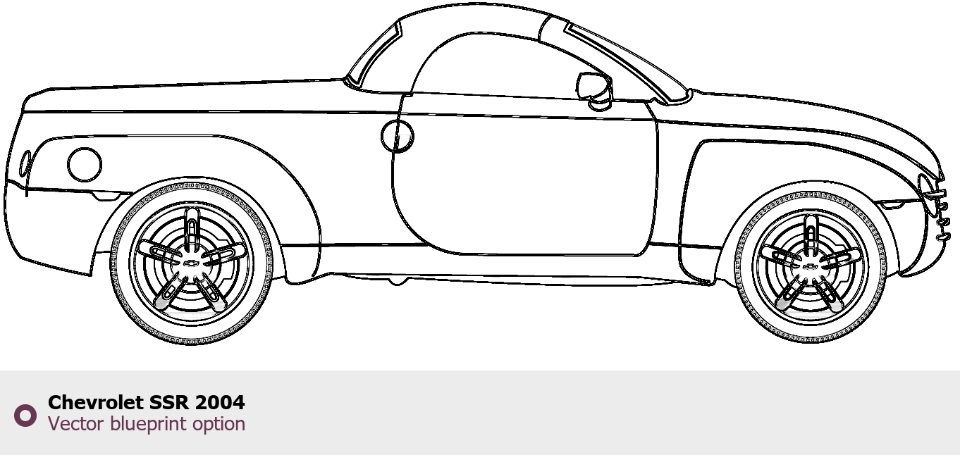 Raster blueprint of the 2004 Chevrolet SSR Pickup Truck. This free downloadable image can be used for graphic projects, digital design, and 3D modeling. The file provides accurate exterior proportions of the vehicle. Model year: 2004. Body type: Pickup Truck.