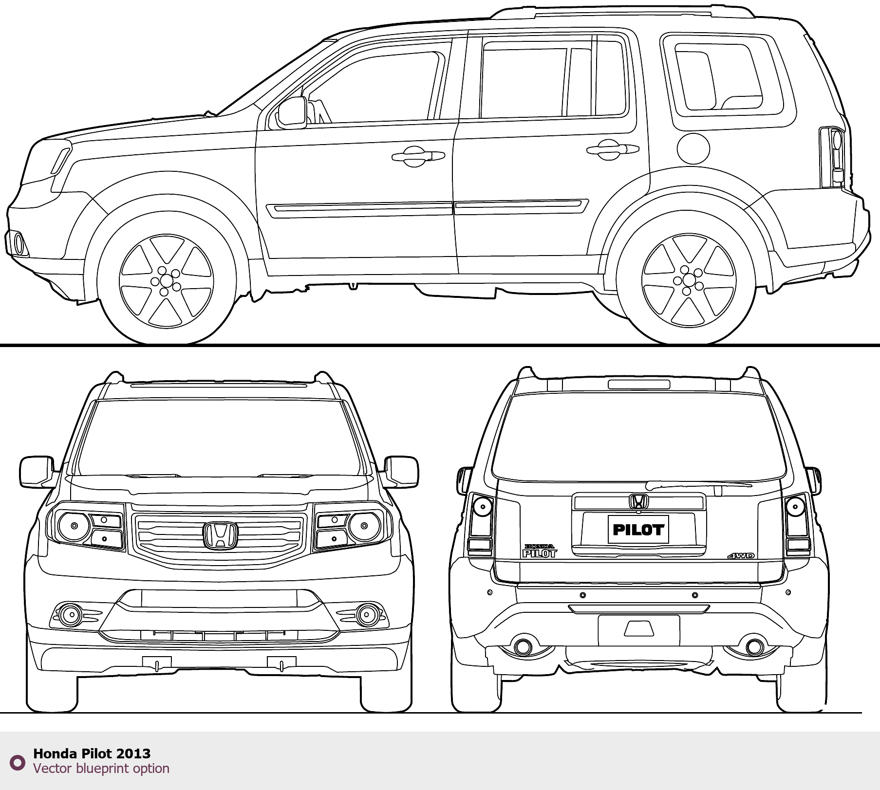 Raster blueprint of the 2013 Honda Pilot SUV. This free downloadable image can be used for graphic projects, digital design, and 3D modeling. The file provides accurate exterior proportions of the vehicle. Model year: 2013. Body type: SUV.