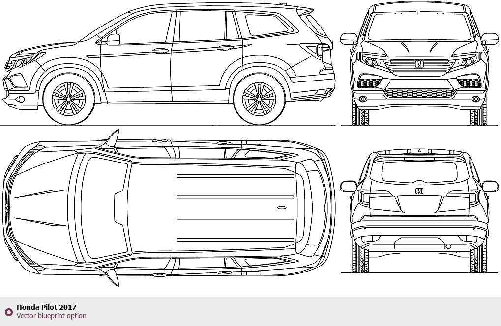 Raster blueprint of the 2017 Honda Pilot SUV. This free downloadable image can be used for graphic projects, digital design, and 3D modeling. The file provides accurate exterior proportions of the vehicle. Model year: 2017. Body type: SUV.