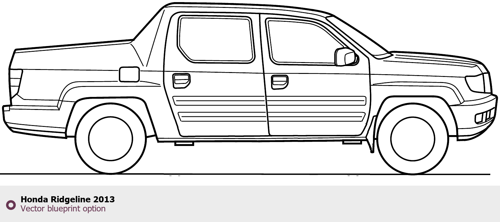 Raster blueprint of the 2013 Honda Ridgeline Pickup Truck. This free downloadable image can be used for graphic projects, digital design, and 3D modeling. The file provides accurate exterior proportions of the vehicle. Model year: 2013. Body type: Pickup Truck.