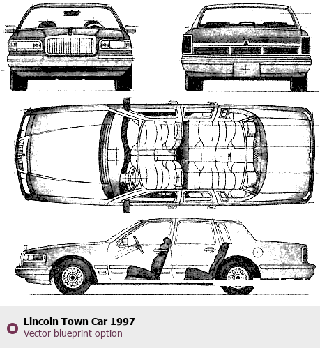 Raster blueprint of the 1997 Lincoln Town Car Sedan. This free downloadable image can be used for graphic projects, digital design, and 3D modeling. The file provides accurate exterior proportions of the vehicle. Model year: 1997. Body type: Sedan.
