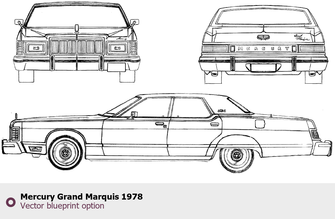 Raster blueprint of the 1978 Mercury Grand Marquis Tag. This free downloadable image can be used for graphic projects, digital design, and 3D modeling. The file provides accurate exterior proportions of the vehicle. Model year: 1978. Body type: Tag.