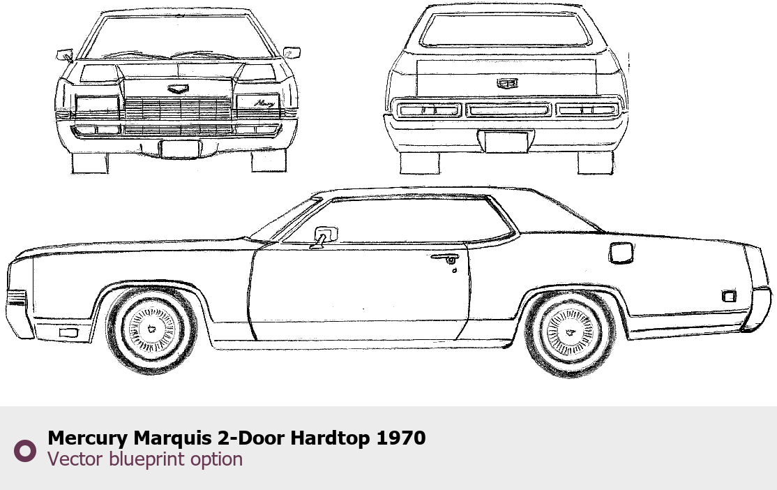 Raster blueprint of the 1970 Mercury Marquis 2-Door Hardtop Tag. This free downloadable image can be used for graphic projects, digital design, and 3D modeling. The file provides accurate exterior proportions of the vehicle. Model year: 1970. Body type: Tag.