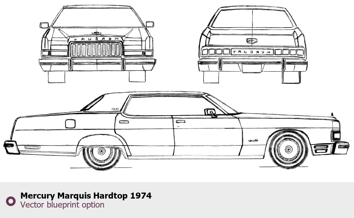Raster blueprint of the 1974 Mercury Marquis Hardtop Tag. This free downloadable image can be used for graphic projects, digital design, and 3D modeling. The file provides accurate exterior proportions of the vehicle. Model year: 1974. Body type: Tag.
