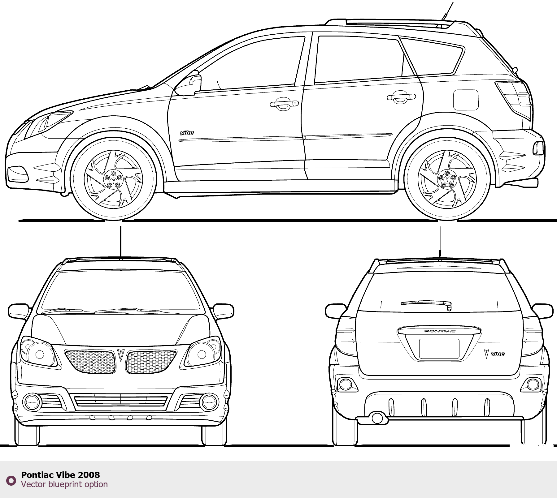 Raster blueprint of the 2008 Pontiac Vibe Hatchback. This free downloadable image can be used for graphic projects, digital design, and 3D modeling. The file provides accurate exterior proportions of the vehicle. Model year: 2008. Body type: Hatchback.