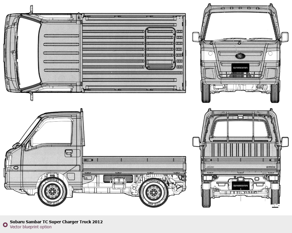Raster blueprint of the 2012 Subaru Sambar TC Super Charger Truck Heavy Truck. This free downloadable image can be used for graphic projects, digital design, and 3D modeling. The file provides accurate exterior proportions of the vehicle. Model year: 2012. Body type: Heavy Truck.